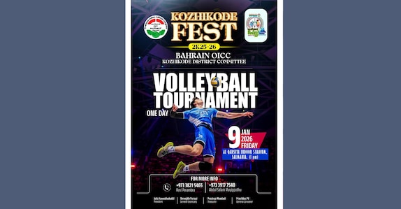 മനാമ ∙ ഒഐസിസി കോഴിക്കോട് ജില്ലാ കമ്മിറ്റിയുടെ ആഭിമുഖ്യത്തിൽ ബഹ്റൈനിൽ നടന്നുവരുന്ന 'കോഴിക്കോട് ഫെസ്റ്റി'ന്റെ ഭാഗമായി ഏകദിന വോളിബോൾ ടൂർണമെന്റ് സംഘടിപ്പിക്കുന്നു. ജനുവരി 9ന് ഉച്ചക്ക് 1 മണി മുതൽ സൽമാനിയയിലെ അൽ ഖദ്സിയാ ഇൻഡോർ സ്റ്റേഡിയത്തിൽ വച്ചാണ് മത്സരങ്ങൾ നടക്കുക. കൂടുതൽ വിവരങ്ങൾക്ക്: കൺവീനർ രവി